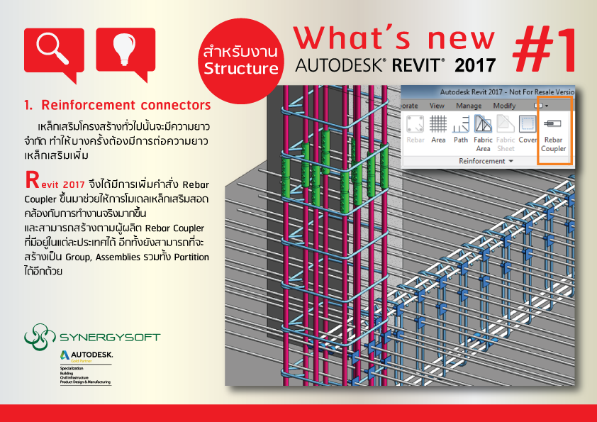 ในการทำงานเหล็กเสริมที่หน้างานก่อสร้าง เหล็กเสริมโครงสร้างทั่วไปนั้นจะมีความยาวจำกัด ทำให้ต้องมีการต่อความยาวเหล็กเสริมนั้น ซึ่งอาจใช้วิธีการต่อทาบเหล็กหรือใช้อุปกรณ์เสริม เช่น Rebar Coupler เป็นต้น ทำให้ใน Revit 2017 นี้ได้มีการเพิ่มคำสั่ง Rebar Coupler ขึ้นมา เพื่อช่วยในการโมเดลเหล็กเสริมคอนกรีตให้สอดคล้องกับการทำงานจริงมากขึ้น ซึ่ง Rebar Coupler นี้ ถือเป็น Revit Family base ประเภทหนึ่ง ที่จะสามารถสร้างขึ้นตามผู้ผลิต Rebar Coupler ที่มีอยู่ในแต่ละประเทศได้ อีกทั้งยังสามารถที่จะสร้างเป็น Group , Assemblies รวมทั้ง Partition ได้อีกด้วย