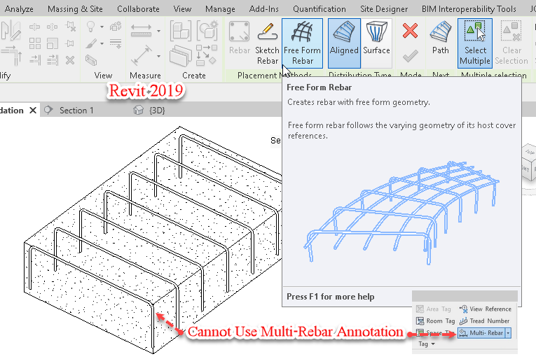 หากผู้ใช้งานต้องการใช้คำสั่ง Multi-Rebar Annotation เพื่อทำการชี้บอกรายละเอียดของเหล็กเสริมนั้น Revit ในเวอร์ชั่นก่อนหน้านี้ จะไม่สามารถใช้คำสั่งนี้เพื่อทำการชี้บอกรายละเอียดของเหล็กเสริมที่ถูกสร้างจากชุดคำสั่ง Freeform ได้ ดังรูป
