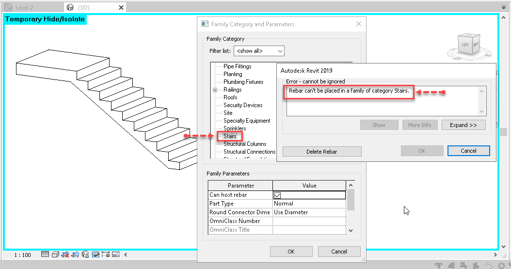 หากผู้ใช้งานต้องการสร้างเหล็กเสริม(Rebar)ใน Revit ในเวอร์ชั่นก่อนหน้านี้ จะไม่สามารถสร้าง Rebar ให้กับ Model-In Place ประเภทบันไดได้ ทำให้ต้องสร้าง Model-In Place ในโครงสร้างประเภทอื่นๆแทน ดังรูป