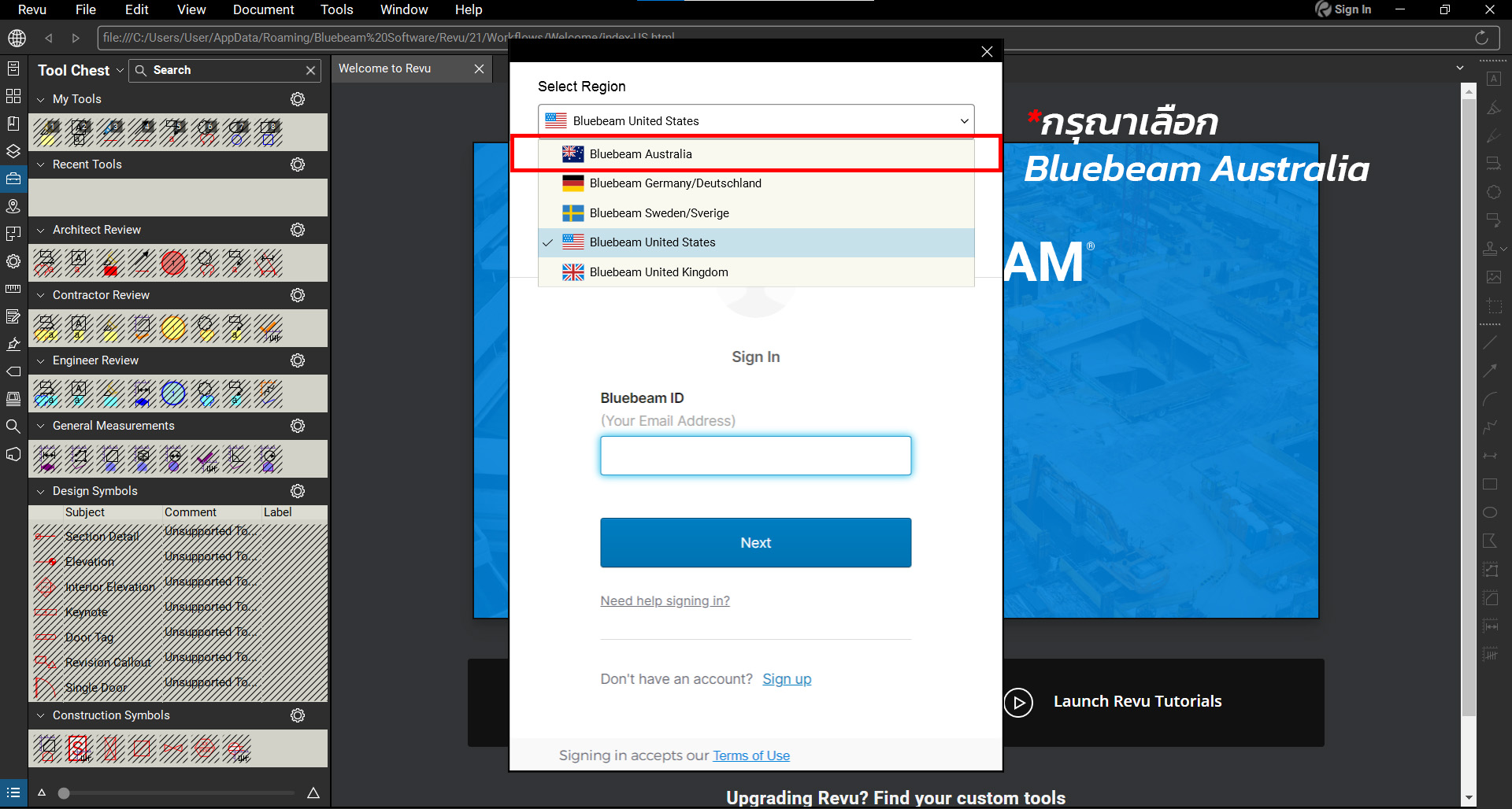 14. เลือกภาษาเป็น Bluebeam Australia , หากมีการสร้าง accout ไว้อยู่แล้ว สามารถใส่อีเมลของผู้ใช้งานและกดคลิก Next